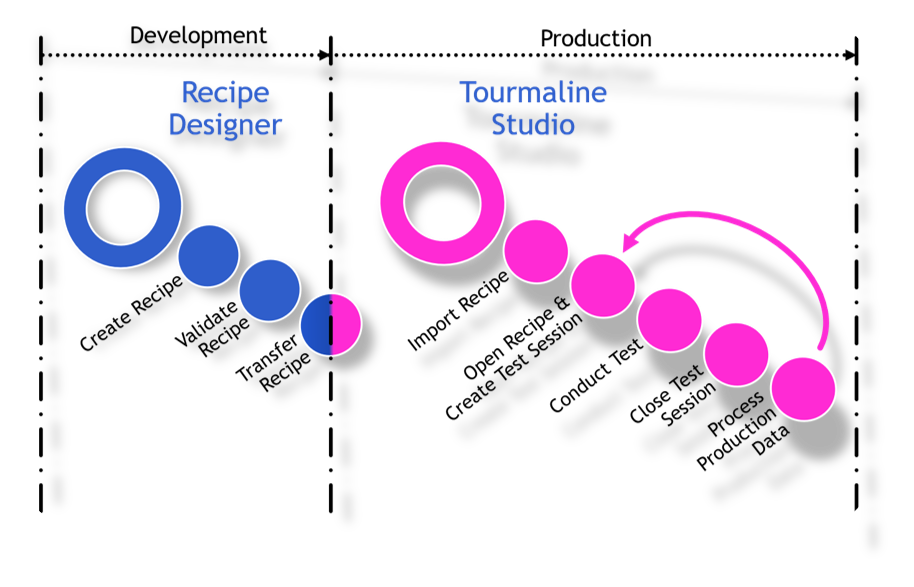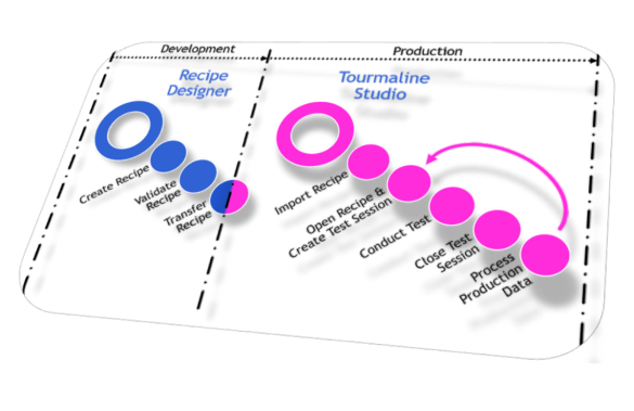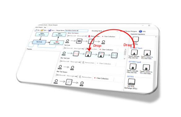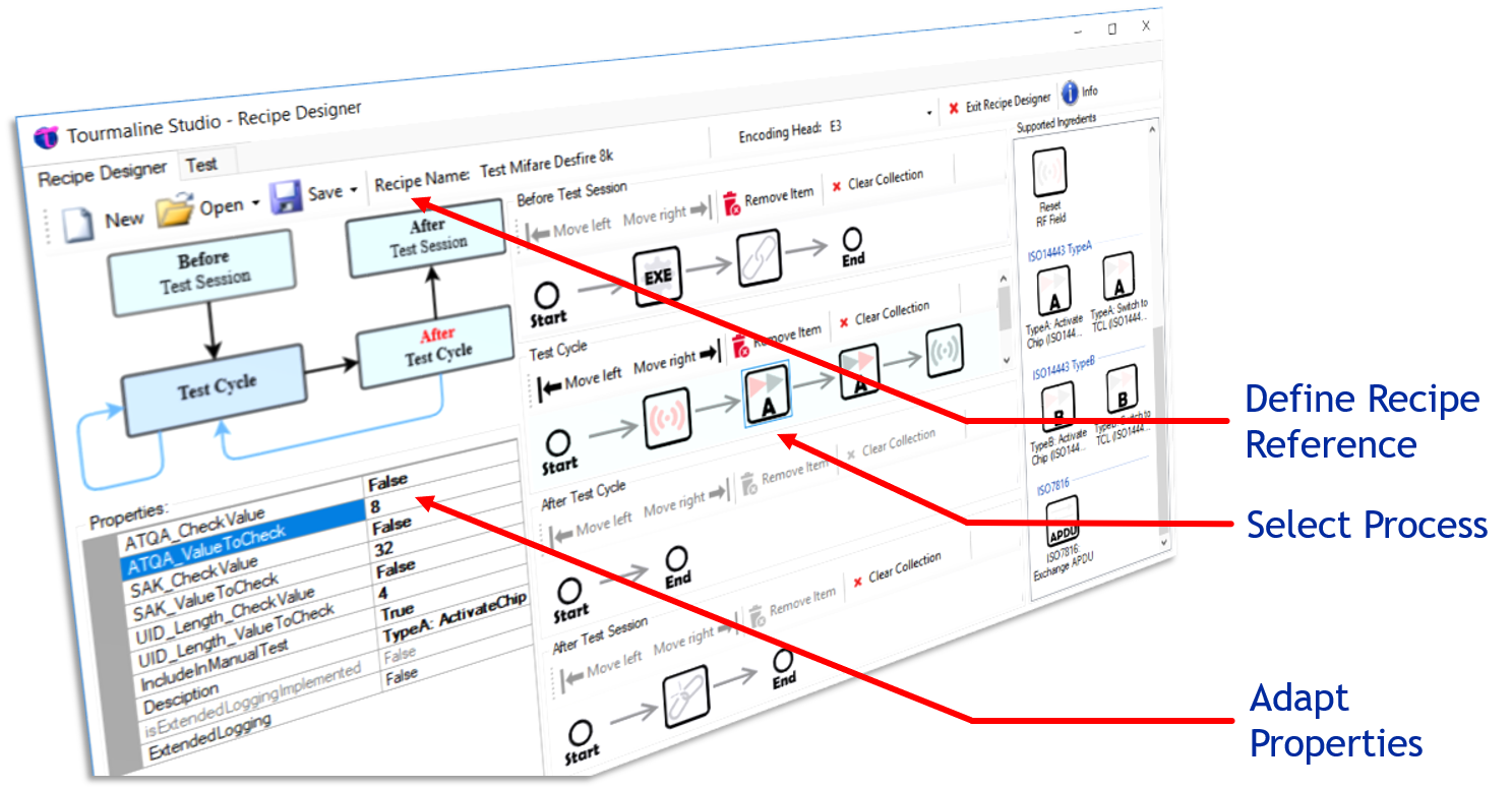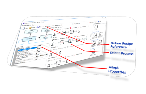 TheTourmaline Studio Recipe Designer implements an easy- and user friendly interface to conveniently generate Recipes – a collection of processes and operating plans that defines the test, initialization, prepersonalization or any other enhanced encoding sequence to be executed.